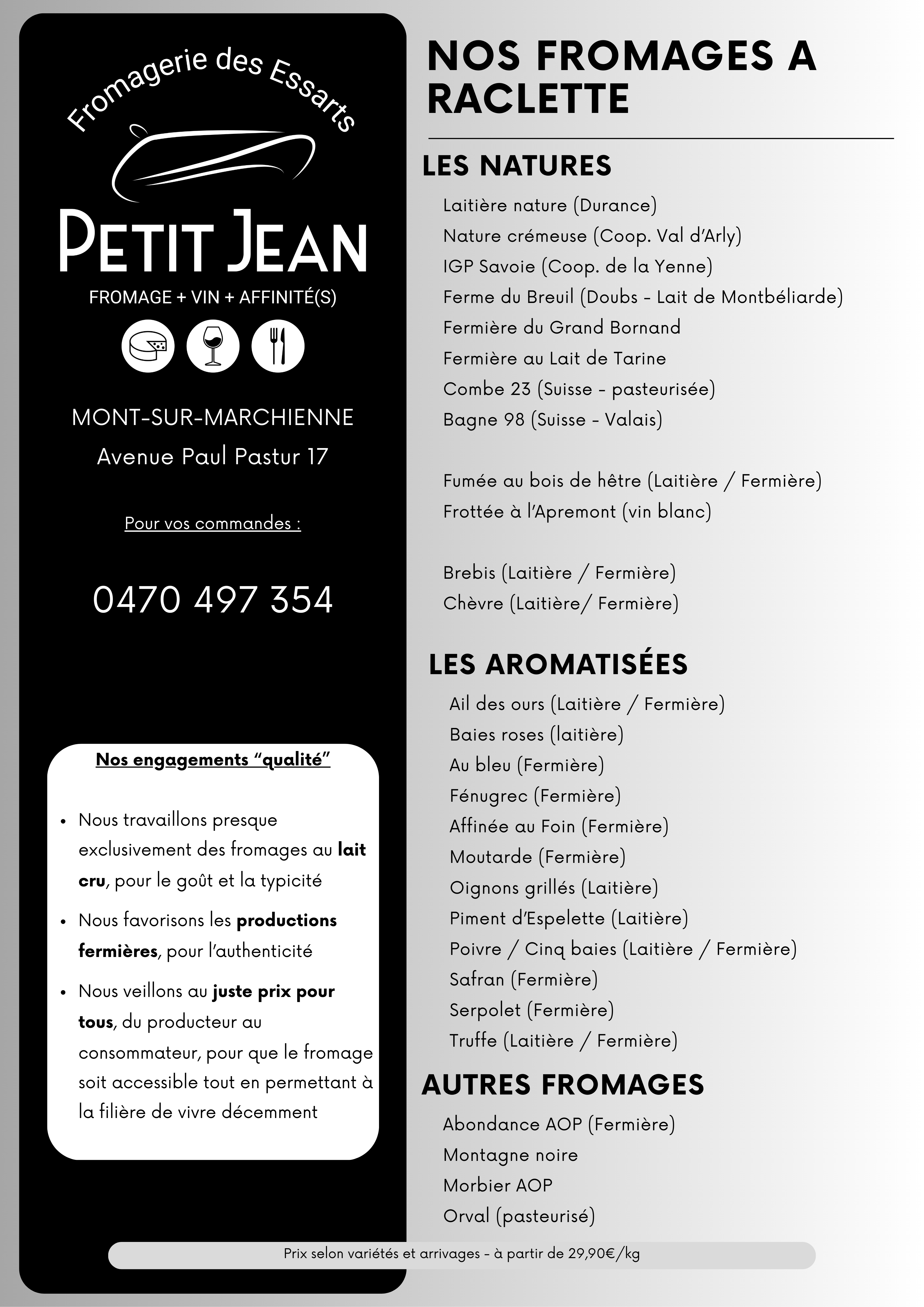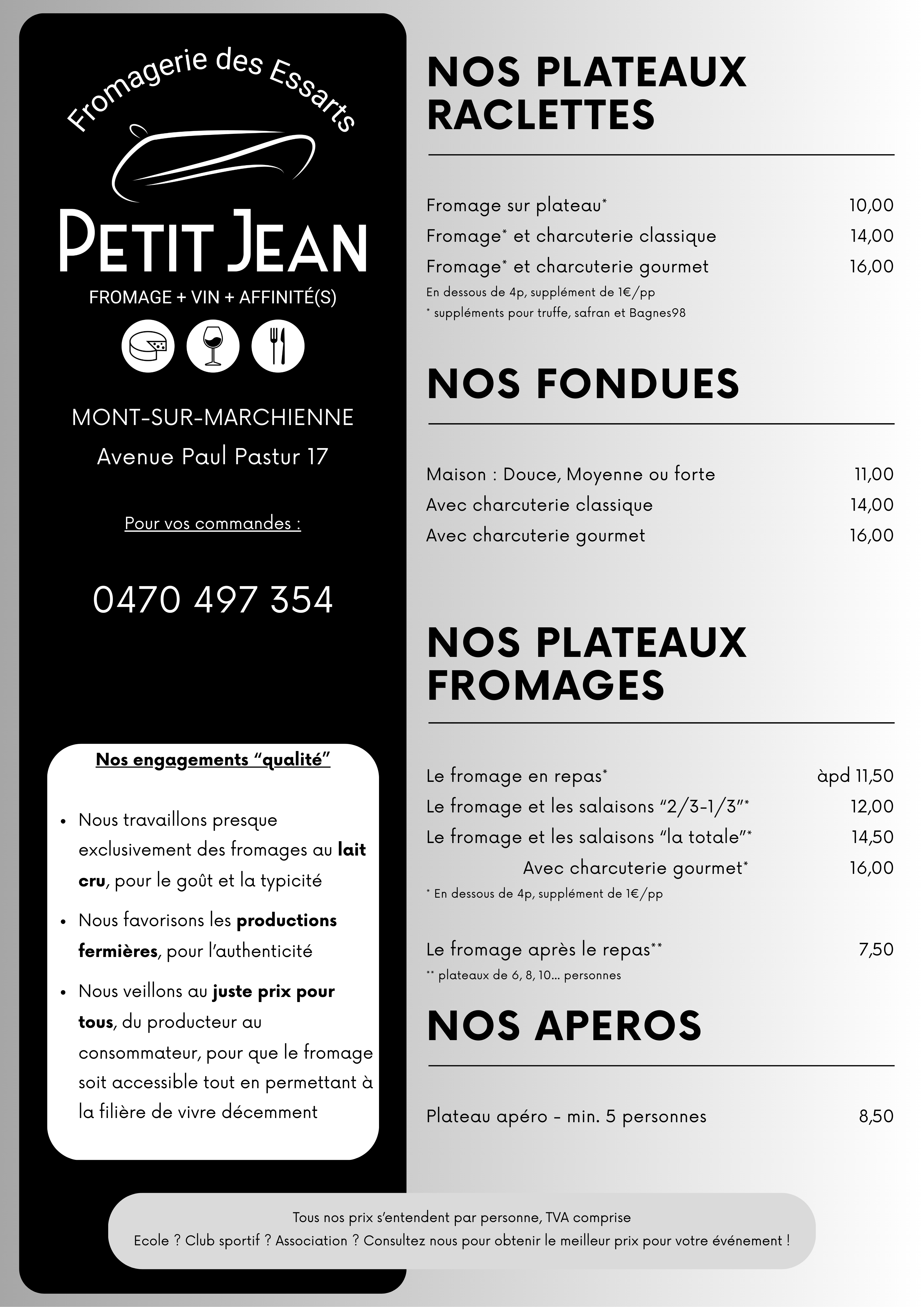 Chez Petit Jean, le fromage est une passion ! Nous nous efforçons de vous offrir la plus large gamme de produits possibles : plateaux et buffets fromages, bières artisanales, vins, yaourts, beurres…